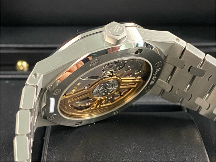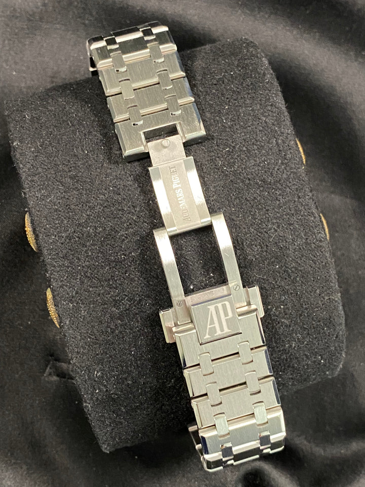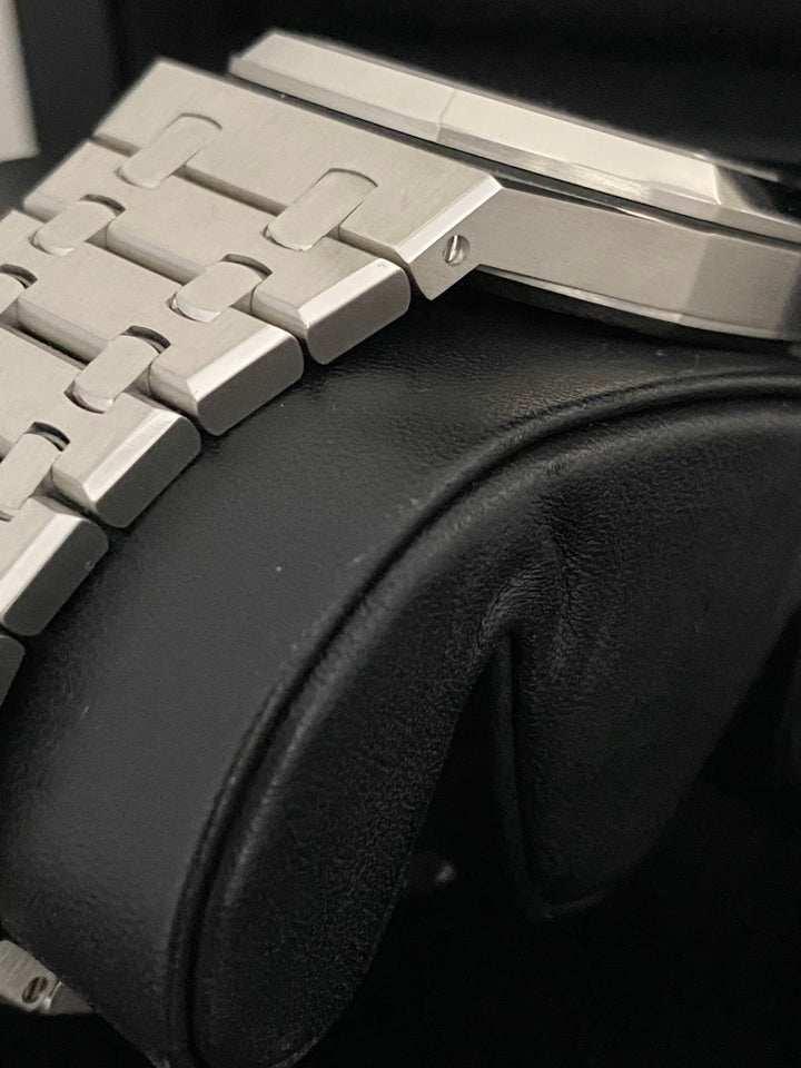 This watch is used but in super mint condition and will come complete with all original Audemars Piguet accessories when purchased. The bracelet is in perfect shape as seen in the photo gallery. This timepiece was originally purchased from AD in May 2021. We provide a 1-year Warranty.