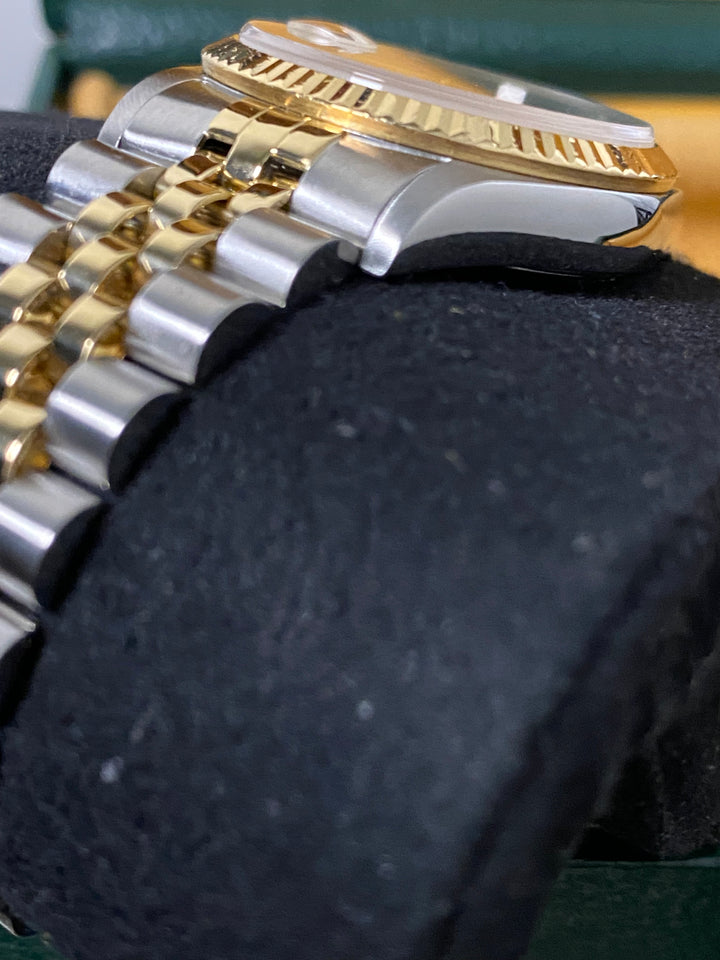 This watch is used but in exceptional condition and will come with an original Rolex box and paper when purchased. Considering its age, the jubilee bracelet is in superb shape with an obvious signs of stretch as seen in the photo gallery. This timepiece has a S serial and was originally purchased from AD in 1997 as indicated on its warranty paper. We provide a 1-year Warranty.