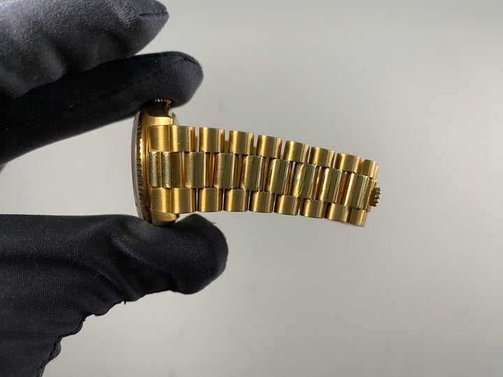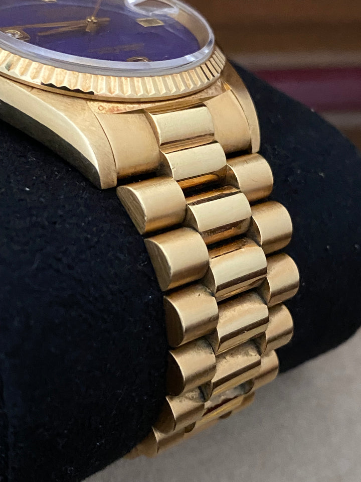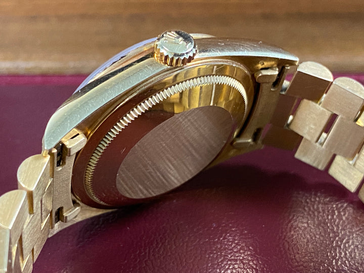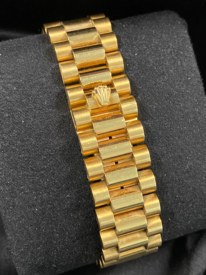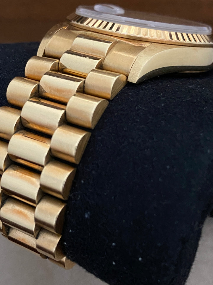 This watch is used but in exceptional condition and will come complete with all original Rolex accessories when purchased. Considering its age, the president bracelet is in superb shape with very minimal signs of stretch as seen in the photo gallery. This timepiece has a R serial and was originally purchased from AD in 1988 as indicated on its warranty paper. We provide a 1-year Warranty.