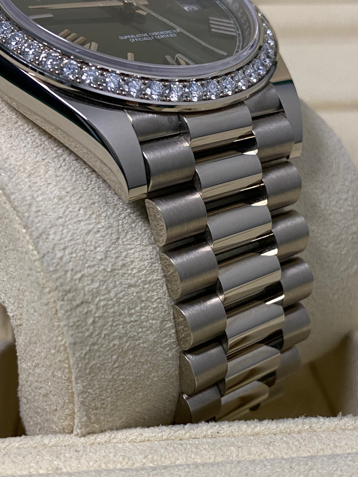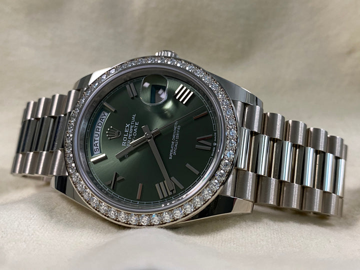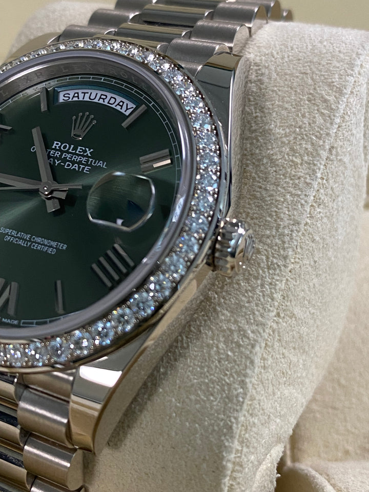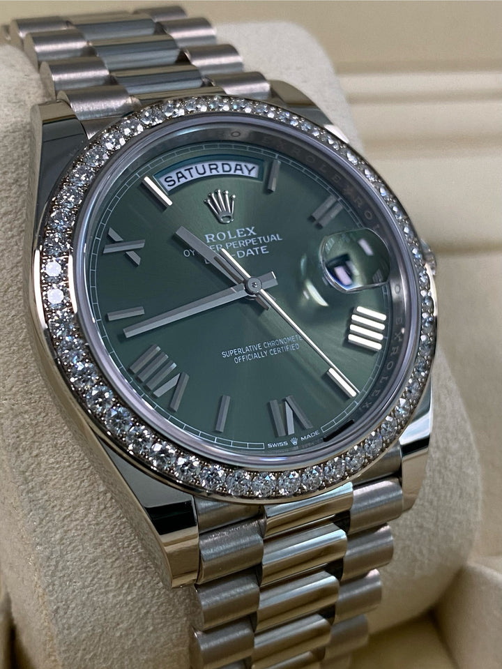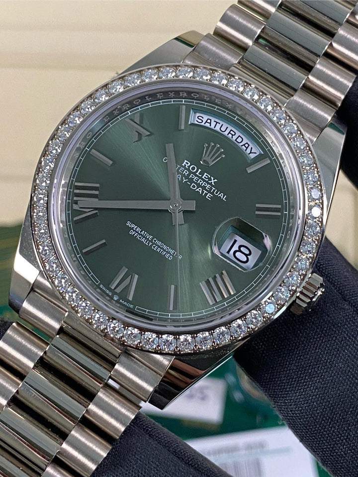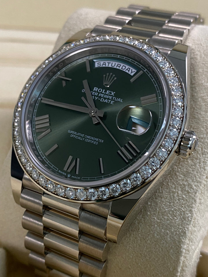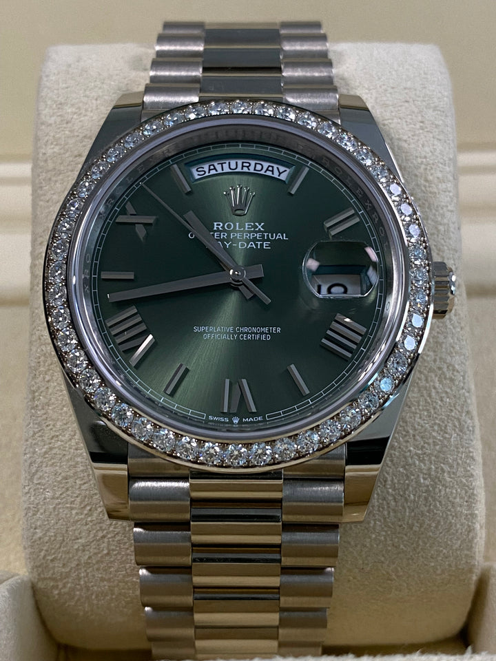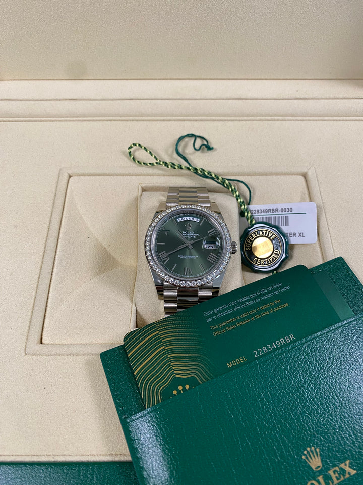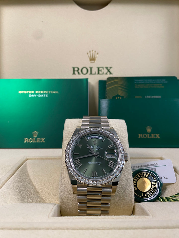 Rolex Day-Date 40 - 2025 -Diamond-Set Bezel - Olive Green Dial - President Bracelet - 228349RBR *FULL SET*