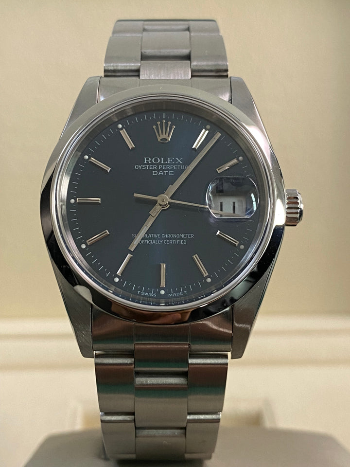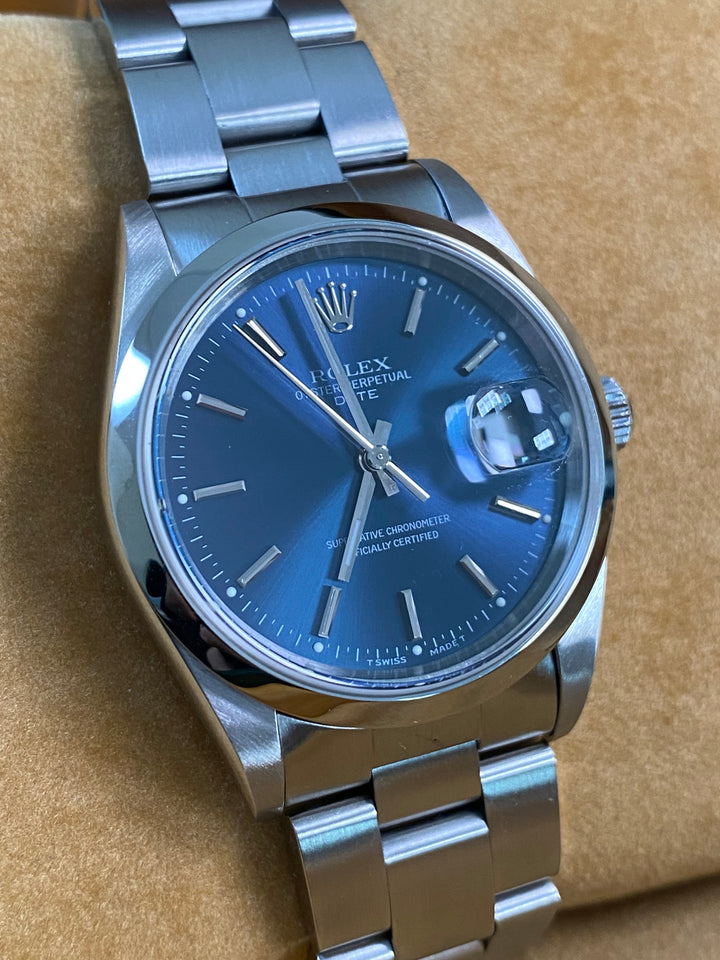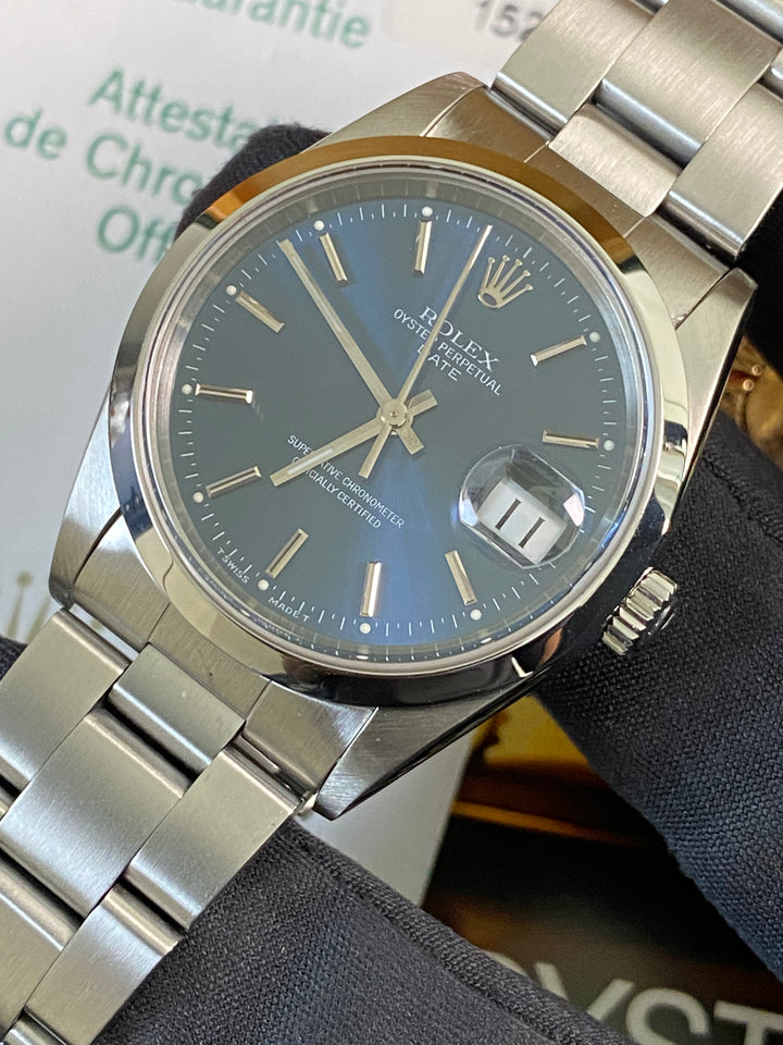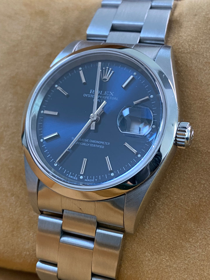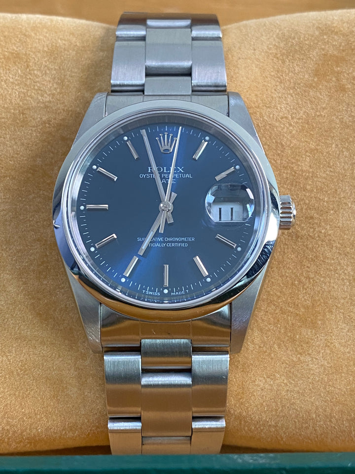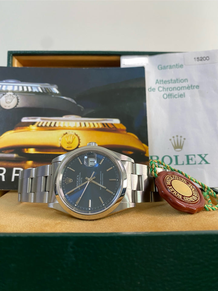 Rolex Steel Oyster Perpetual Date - 2001 - Domed Bezel - Blue Index Dial - 15200 *FULL SET*