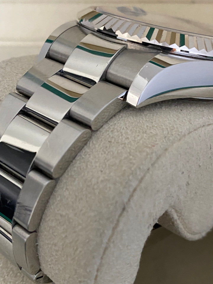 This watch is used but in mint condition, unpolished, and will come complete with all original Rolex accessories when purchased. The oyster bracelet is in superb shape as seen in the photo gallery. This timepiece was originally purchased from AD in May 2019 as indicated on its warranty card. We provide a 1-year Warranty.