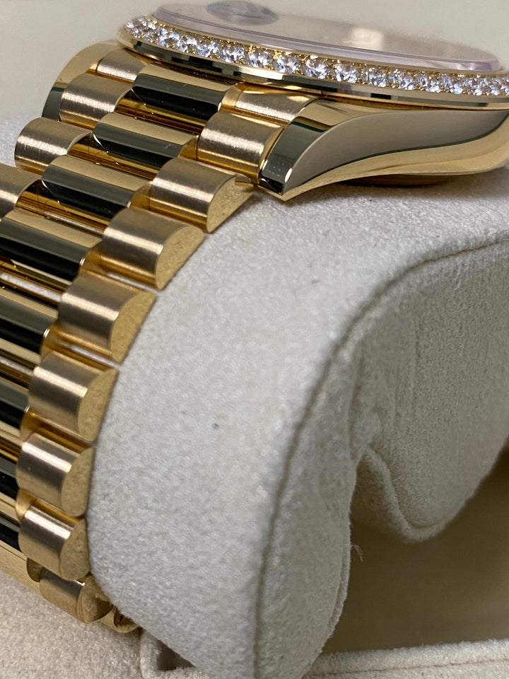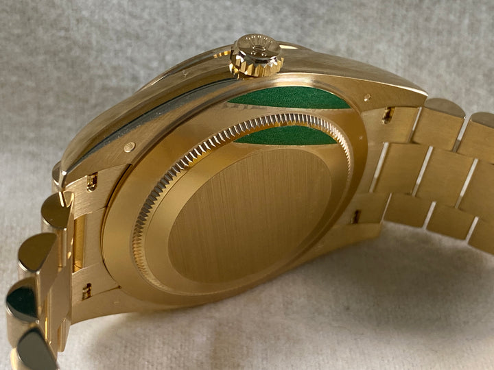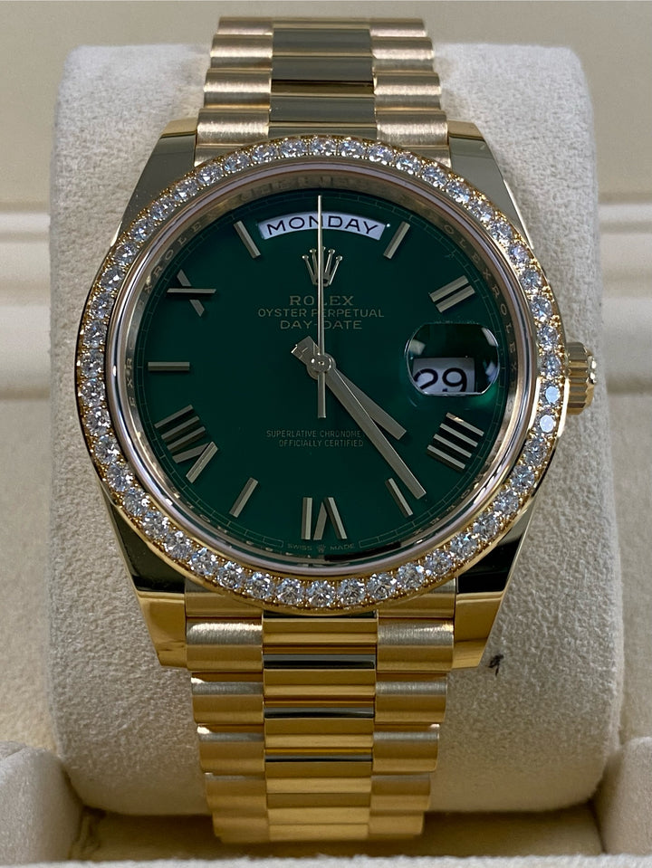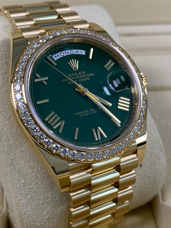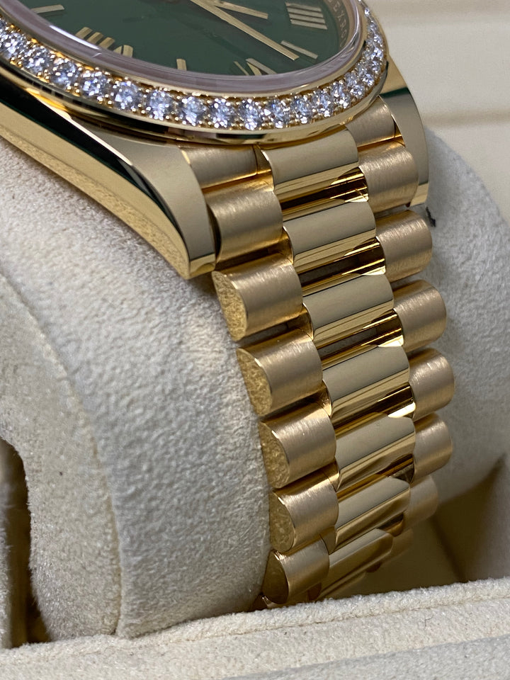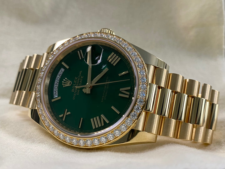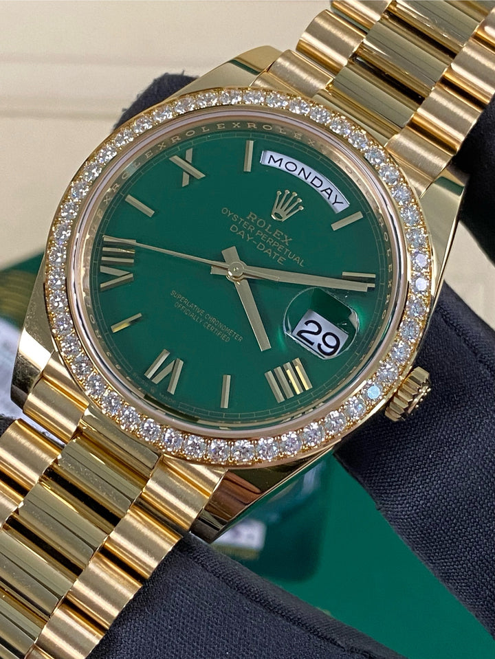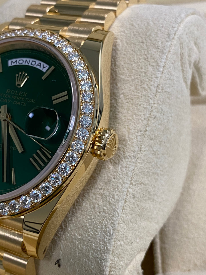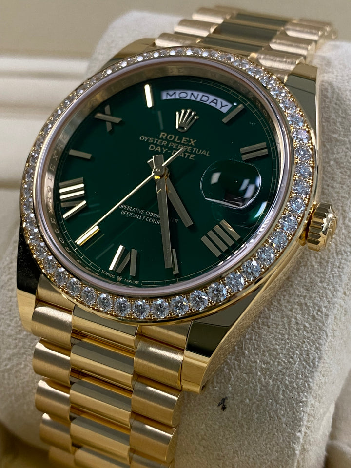 Rolex Yellow Gold Day-Date 40 - 2022 - Diamond-set Bezel - Green Roman Dial - 228348RBR *FULL SET*